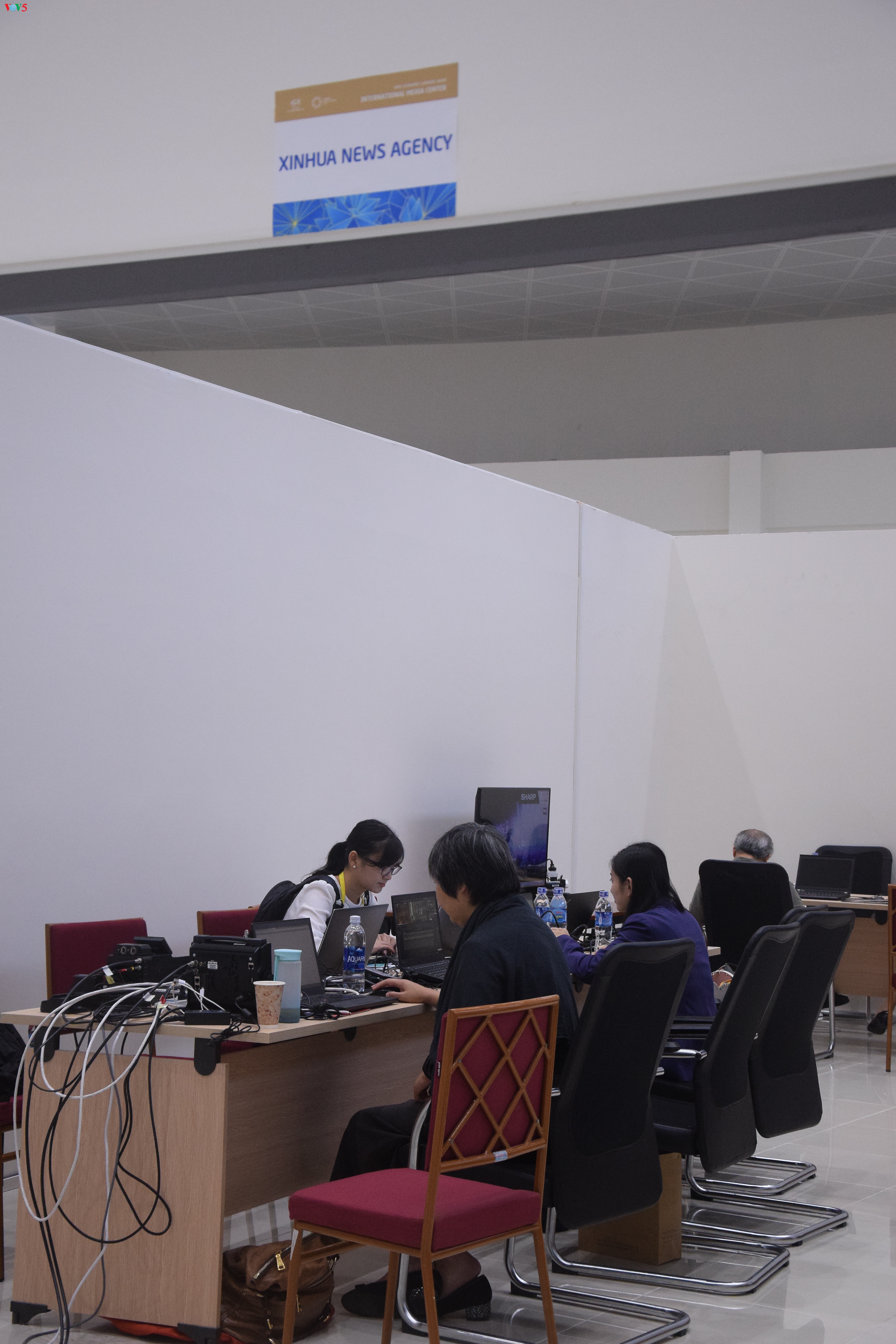 Suasana kerja dari wartawan di Pusat Pers Internasional APEC
