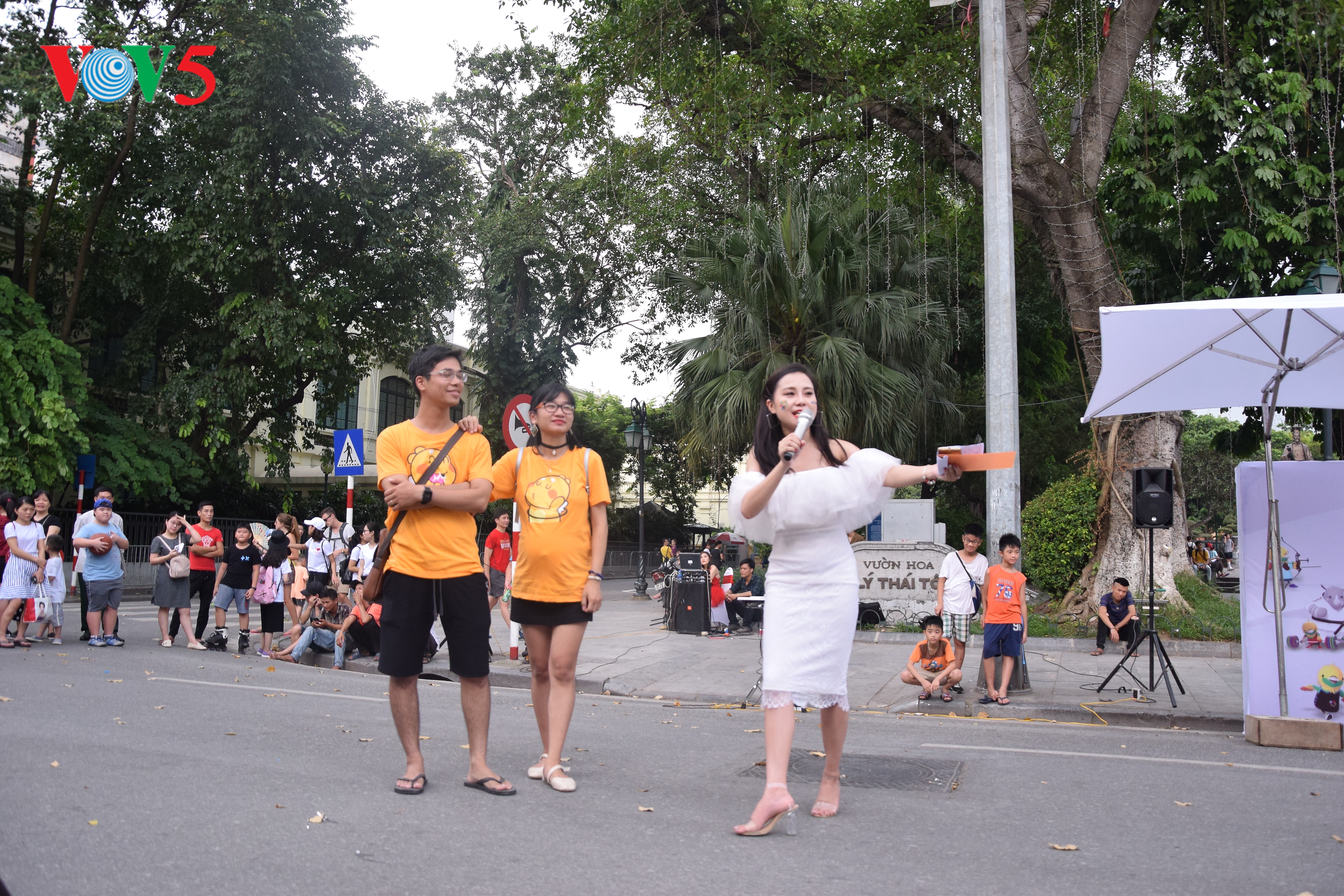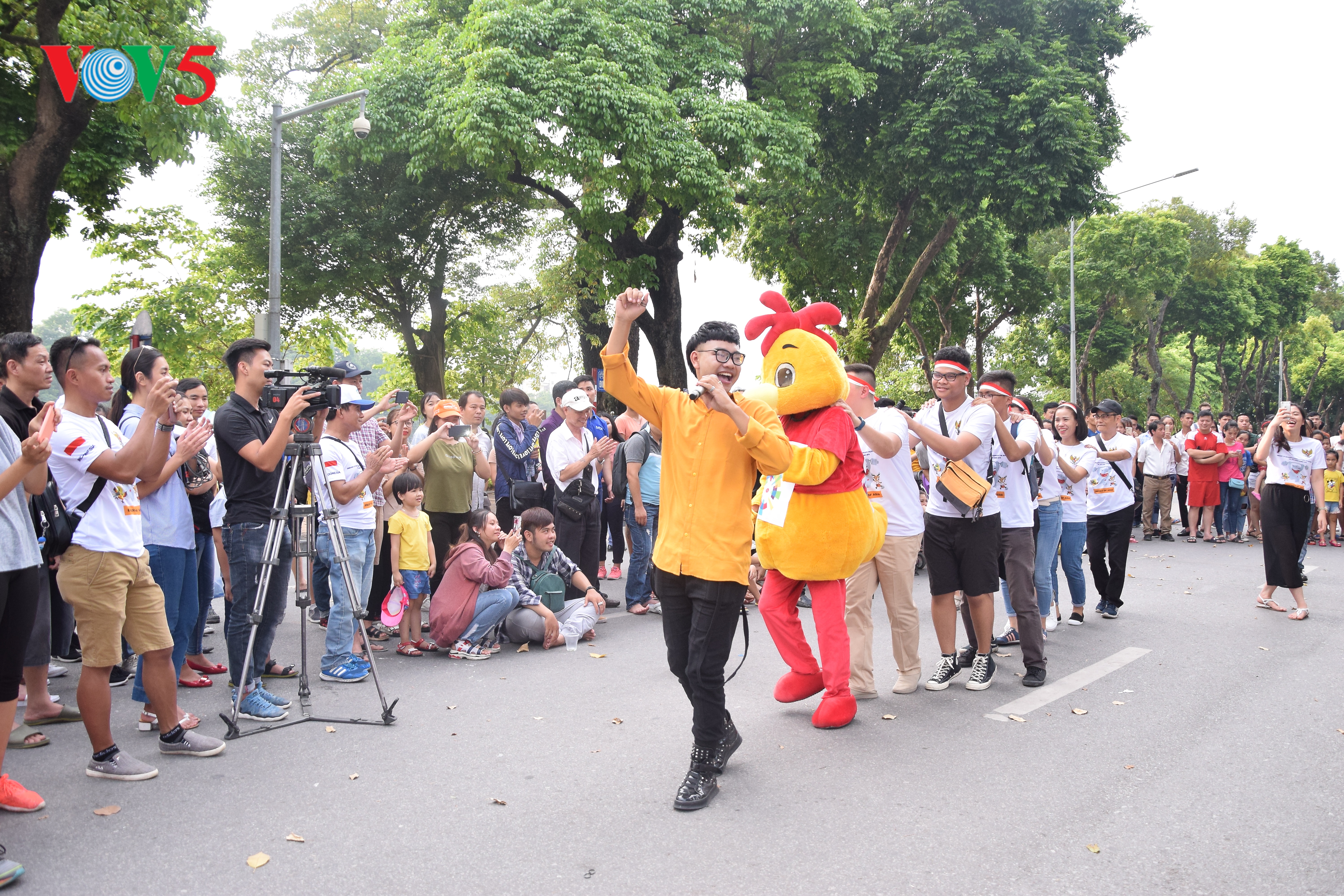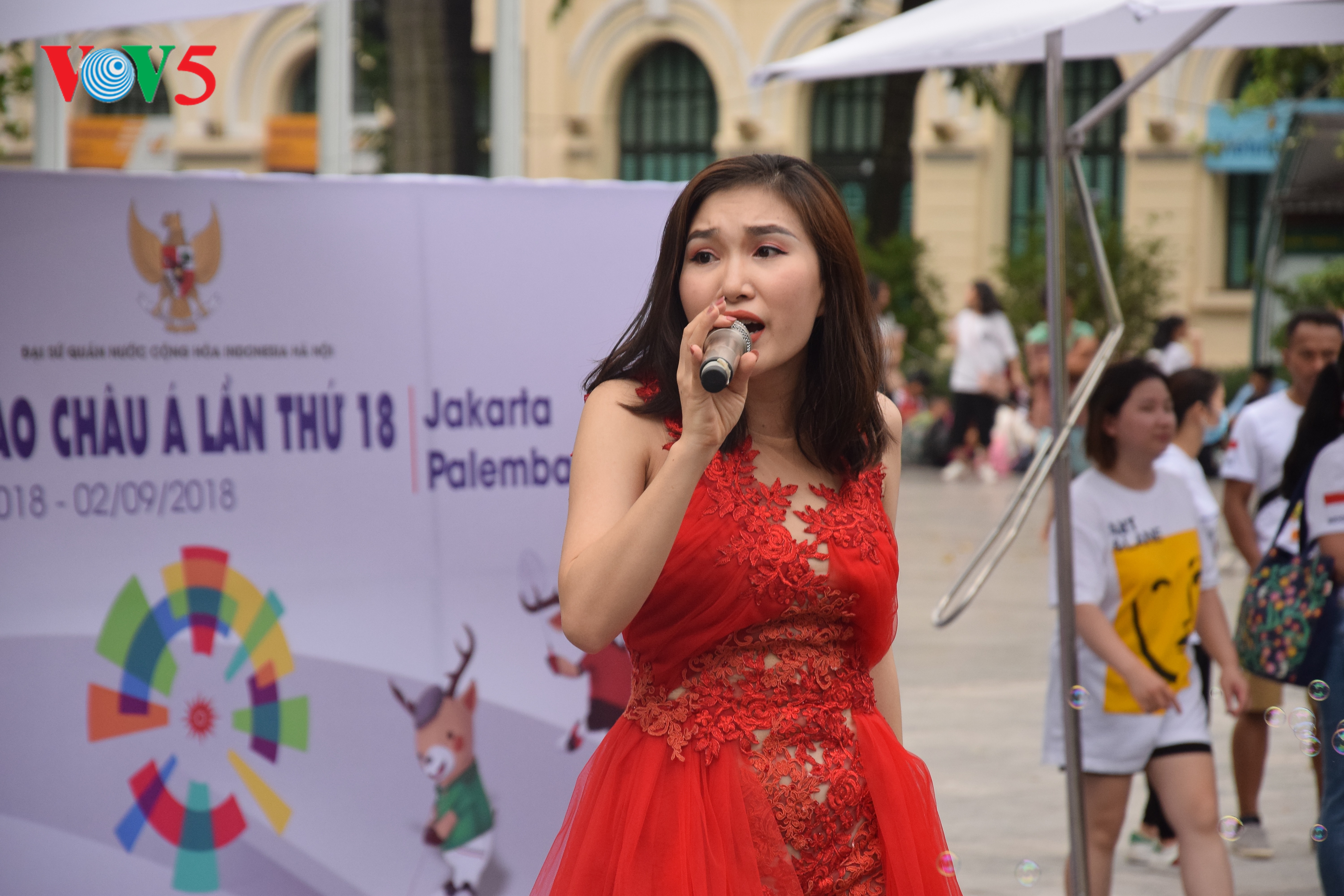 Banyak pemuda Indonesia dengan para staf KBRI Hanoi dalam seragam baju putih dengan logo ASIAD 2018 meramaikan ruangan jalan untuk pejalan kaki di danau Hoan Kiem dengan tarian tradisional Indonesia.