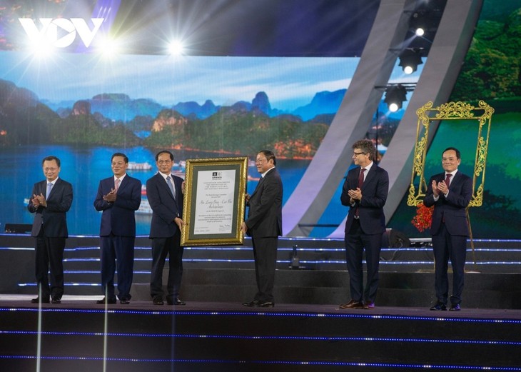 Wakil UNESCO menyampaikan Piagam pengakuan Teluk Ha Long (Provinsi Quang Ninh) - Kepulauan Cat Ba (Kota Hai Phong) sebagai Warisan Alam Dunia antar provinsi dan kota yang pertama di Vietnam (Foto: VOV)