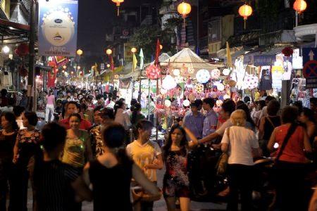 Wisatawan ketika datang ke kota Hanoi biasanya suka berjalan kaki mengelilingi sektor kota kuno untuk menguak rahasia tempat ini. Wisatawan di semua penjuru turun ke jalan-jalan dan masuk ke toko-toko, galeri gambar yang sangat mengesankan dengan bermacam-macam karakter.Ketika melewati jalan Hang Gai, Hang Hom, Hang Ma, Hang Bac, Hang Buom dll… di mana-mana juga kelihatan suasana perbelanjaan yang hiruk pikuk. Di semua toko pakaian di sini, ada banyak model pakaian yang indah, harganya juga tidak mahal. Jika wisatawan menyukai kain dan busana dari sutera, datang-lah ke jalan Hang Gai dan jalan-jalan di sekitar-nya. Gerai-gerai tas dan suvenir tampaknya menggandoli kaki wisatawan yang tidak ingin ke luar karena keunikan maupun warna-warni produk. Kemudian berjalan kaki di jalan Hang Bac, Hang Ho untuk membeli barang-barang dari perak, kalung dan gelang tangan yang harganya kira-kira VND 100 000 (sama dengan kira-kira USD 5) dengan bermacam-macam desain yang unik. Saudara Thomas yang datang dari Amerika Serikat memberitahukan: “Saya suka berbelanja di sini. Saya melihat barang-barang dari perak di sini sangat berkualitas dan harganya sedangan. Di sini ada banyak barang-barang yang bernilai. Saya telah membeli bunga, gambar, kalung perak, pakaian dll.. Makanan-manakan di sini juga enak rasanya dan murah”.
