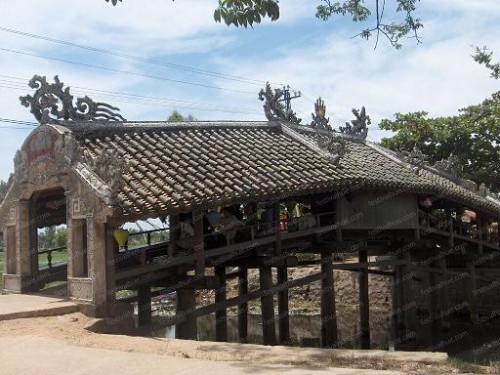Jembatan beratap Thanh Toan dibuat dari kayu dan dibangun tahun 1776 dengan bentuk di atasnya rumah sedangkan di bawahnya jembatan. Jembatan ini diperuntukan bagi warga desa di dua tepian untuk bisa bepergian dengan praktis, tidak memerlukan sampan penyeberangan dan juga bagi para pejalan kaki serta orang-orang yang telat kendaraan, bahkan bagi warga setempat yang duduk beristirahat untuk menikmati udara pada hari panas dan pada malam hari yang sejuk. Di sebelah sana jembatan ialah rumah tempat memamerkan alat-alat untuk pertanian dan perikanan seperti bajak, garu, sabit dll… Di dalam rumah ini juga direkonstruksikan aktivitas-akativitas kehidupan warga di daerah pedesaan Thanh Thuy seperti merontokkan padi, menumbuk beras, menapis dan menganyam bambu dan rotan.Wisatawan juga langsung bisa menggiling tepung dan belajar membuat kue atau berperahu di sungai. Saudari Duong Thi Cong Ly, Wakil Direktor Perusahaan Pariwisata Persero Vietnam di kota Hue memberitahukan: “Di sini, ada banyak orang yang merekonstruksikan suasana kerja dulu. Wisatawan mancanegara ketika datang ke sini sangat menyukai daerah pedesaan ini karena masih mempertahankan secara utuh kekhasan daerah pedesaan di Vietnam Tengah. Perusahaan kami membuat banyak paket wisata yang memakan waktu sehari atau setengah hari. Wisatawan bisa naik sepeda motor dari pusat kota ke sini”.