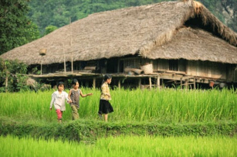 Rumah panggung dari warga etnis minoritas Tay di dukuh Tha, provinsi Ha Giang