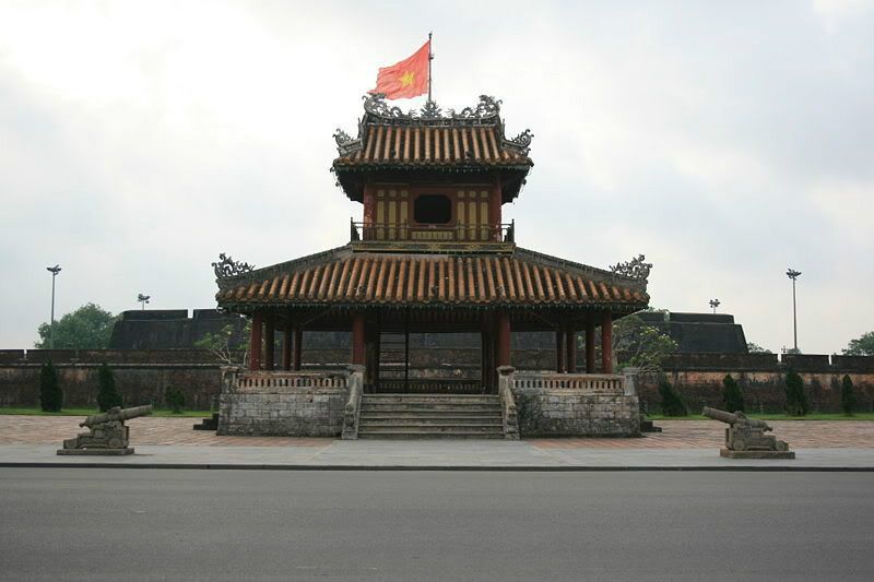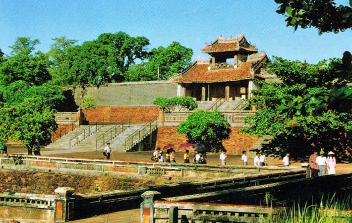 Dari tahun 1802 sampai 1945, Hue merupakan ibukota dari negara Vietnam yang satu dibawah pimpinan dari 13 Raja pada zaman dinasti Nguyen. Juga selama waktu itu, di sana, telah dibangun bangunan-bangunan arsitektur sejarah dan kebudayaan yang berharga. Bisa dikatakan ialah di sebelah arah sungai Huong, ada sistim arsitektur yang memanifestasikan kekuasaan otoriter dari rezim sentralisme dinasti Nguyen yang terdiri dari tiga bangunan yaitu Ibukota kerajaan Hue, benteng kerajinan Hue dan Benteng larangan Hue. Sistim benteng di sana merupakan satu percontohan dari kombinasi yang harmonis antara inti sari arsitektur Timur dan Barat yang diletakkan dalam ruang alam yang luar biasa dengan faktor-faktor simbolik yang sudah ada dalam alam sekitar seperti gunung Ngu, sungai Huong, tanah gosong Gia Vien, tanah gosong Boc Thanh. Benteng kerajaan dibatasi oleh satu tembok benteng yang hampir persegi dengan sisi yang panjangnya kira-kira 600 meter dengan 4 pintu gerbang, tapi yang paling unik menjadi simbol dari ibukota kuno yaitu Ngo Mon. Ini adalah zona administrasi tertinggi pada zaman dinasti Nguyen. Yang menjelujuri tiga bangunan tersebut, ada jalan Than Dao yang dimulai dari tepi sungai Huong dengan bangunan-bangunan arsitektur yang paling penting dari ibukota kerajaan Hue seperti Nghinh Luong Dinh, Phu Van Lau, Ky Dai, Ngo Mon, Istana Thai Hoa, Istana Can Chanh, Istana Can Thanh. Di dua tepian jalan Than Dao, ada ratusan bangunan arstitekur besar dan kecil yang dibangun secara seimbang dan teratur di tengah-tengah ruang alam sekitar.