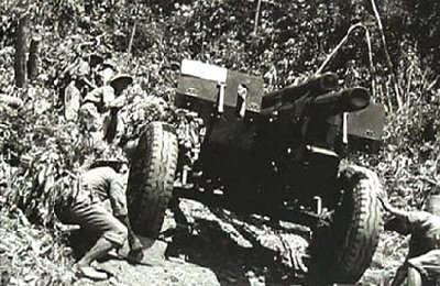 Para prajurit menarik meriam untuk ikut serta pada operasi Dien Bien Phu