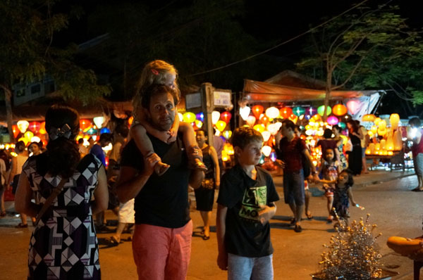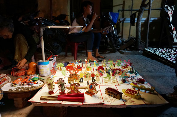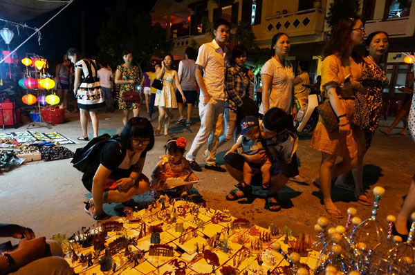 Ketika kota ini sudah memasang lampu listrik sekaligus juga adalah saat pasar di malam hari di Kota Hoi An mulai menjadi ramai. Di sepanjang dua tepi sungai Hoai yang eksotis adalah toko-toko yang memajang bermacam-macam jenis barang souvenir, produk kerajinan tangan-artistik dari Kota Hoi An. Yaitu lampion-lampion yang berwarna-warni dan To He (sejenis boneka yang dibuat dari tepung) bentuk-nya mungil dibuat secara prigel oleh para tukang keramik Thanh Ha atau bermacam-macam jenis barang sutra, masakan-masakan rakyat yang sekali menikmatinya orang akan tidak bisa melupakan aroma-nya yang khas seperti mihun Quang Nam, Cao Lau, kue kacang hijau, kue It, kolak jagung. Para wisatawan yang pergi ke pasar di malam hari tidak hanya bisa berbelanja saja, melainkan juga berjalan-jalan, menguak tabir hal-hal yang aneh dan unik di tempat ini. Saudari Dan Phuong, warga asal Kota Da Nang yang pergi ke pasar malam Hoi An pada akhir pekan untuk berbaur pada arus orang dan memandangi toko-toko yang berwarna-warni di tepi sungai Hoai yang eksotis serta menikmati beberapa masakan yang lugas di Kota Hoi An memberitahukan: “Bagi saya, tidak tahu apa membuat saya suka pergi ke kota Hoi An. Khususnya, pasar malam, ketika lampu-lampu baru saja dipasang, berjalan-jalan di sektor jalan kota kuno, menikmati masakan-masakan yang khas, kemudian menyusul ialah gerai barang kerajinan tangan artistik yang indah, suasananya ramai, sinar lampu-nya berkilau-kilau, perasaan sungguh nyaman”.