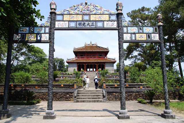 Terletak di tengah-tengah kota Hue, di samping tepian sungai sebelah Utara dari sungai Huong Giang, sistim arsitektur sebagai simbol kekuasaan dari rezim pemerintah pusat pada zaman Dinasti Nguyen yang tetap hidup abadi dalam menghadapi gejolak-gejolak dari waktu dan ruangan. Ibukota kuno Hue di provinsi Thua Thien-Hue sekarang tetap menyimpan warisan-warisan budaya bendawi dan non-bendawi tentang nilai seni arsitektur dan nilai-nilai seni-budaya non-bendawi. Bicara tentang Hue berarti bicara tentang benteng, istana dan kuil yang luar biasa indahnya, mousolium yang megah, situs peninggalan sejarah dan pemandangan alam yang indah. Bicara tentang Hue harus bicara tentang keindahan arsitektur ibukota kerajaan, benteng kerajaan, daerah larangan. Sistim benteng di sini merupakan kombinasi yang harmonis antara intisari Timur dan Barat yang ditempatkan dalam satu pemandangan alam yang indah dengan gunung Ngu Binh, sungai Huong Giang, daerah pasir Gia Vien,daerah Boc Thanh dan lain-lain. Di sebelah Barat ibukota kerajaan yang terletak di tepi sungai Huong Giang, mousolium dari para raja pada zaman dinasti Nguyen dianggap sebagai prestasi-prestasi arsitektur pemandangan alam yang sama sekali membawa cita-cita sendiri di Vietnam. Setiap mousolium raja pada zaman dinasti Nguyen memanifestasikan kehidupan dan karakter dari pemilik yang sedang beristirahat: Mousolium Raja Gia Long yang lugas, tapi megah di tengah-tengah hutan yang berlapis-lapis; mousolium Raja Minh Mang yang megah di tengah-tengah hutan dan danau; mousolium Raja Thieu Tri yang keramat dan sepi di tengah-tengah pesawahan yang luas. Saban tahun, tempat wisata ini telah menyambut datangnya ratusan ribu wisatawan domestik dan mancanegara.