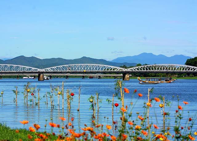 Ketika datang ke ibukota kuno Hue, wisatawan dari semua penjuru juga merasakan satu keindahan yang romantis. Barang kali, sungai Huong Giang yang jernih dan biru sendiri yang mengalir secara lambat-lambat di depan ibukota kerajaan Hue merupakan satu faktor yang menciptakan keindahan yang bersifat puitis. Sungai Huong Giang tidak hanya merupakan poros jalan air, melainkan juga merupakan satu benteng alam yang membela ibukota kerjaaan Hue. Sungai Huong Giang yang dikaitkan dengan gunung Ngu Binh telah menciptakan satu pemandangan alam yang romantis yang bersifat Ketimuran. Bapak Nguyen Xuan Hoa, warga kota Hue dengan bangga bicara tentang sungai ini sebagai berikut: “Sungai Huong Giang laksana satu benda alam yang bernilai terhadap daerah Hue. Jarang ada sungai di Vietnam yang membawa keindahan yang variatif dan romantis seperti sungai ini. Dari barisan gunung Truong Son sampai hutan yang luas, Sungai Huong Giang membawa keindahan yang masih liar dan masih alami. Sungai Huong Giang yang menyeberangi kota Hue lunak seperti helai sutra”.