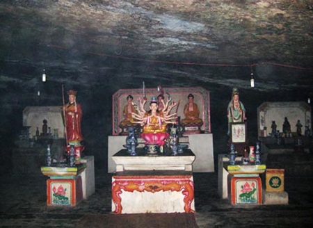 Lapangan pagoda adalah ruang luas. Di tengah-tengah lapangan ini, ada satu danau bunga teratai dan satu patung Buddha Kuan Im besar yang menghadap ke laut. Di sekeliling lapangan ada pohon-pohon ketapang tua yang sudah ada sejak ratusan tahun ini, sehingga membuat penorama pagoda menjadi sunyi-senyap. Di depan pagoda Hang, ada sumur yang disebut sebagai sumur langit. Tetesan-tetesan air di stalaktit di depan pintu gua menetes, sehingga air sumur jernih dan sejuk sepanjang tahun. Para peziarah ketika datang ke pagoda ini sering menadah air untuk makan dan mencuci muka seperti menikmati sumber air dari langit, mengusir semua kelemahan setelah menempuh satu penggalan jalan mendaki gunung. Ketika memasuki pagoda Hang, cuaca-nya sejuk. Khususnya di dalam pagoda ini, juga ada dua jalan kecil yang panjang sekali dengan dua arah yang bertentangan dan disebut oleh warga setempat sebagai “jalan ke langit dan jalan turun ke neraka. Tempat pemujaan pokok ditempatkan di tengah-tengah gua utama dan di dua pintu gua ini, ada dua altar untuk memuja Ametabha, Messiah, Tathagata dan tokoh-tokoh yang berjasa membangun pagoda Hang dengan ukiran-ukiran yang unik dan bekas-bekas di pagoda ini masih membawa segi kebudayaan Cham Pa. Huynh Thuc, warga kecamatan pulau An Vinh memberitahukan: “Khusus di pagoda Hang, ada bekas-bekas warisan orang Cham Pa yaitu altar pemujaan dari batu dan bekas-bekas warisan orang Cham Pa. Itu merupakan segi-segi unik di pagoda ini”.
