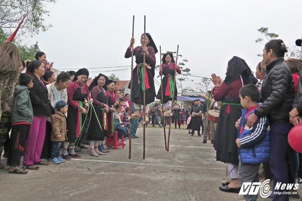 Ketika datang menghadiri Pesta Balai Desa Ngoc Tan, permainan rakyat yang tidak bisa dilewatkan ialah permainan naik egrang. Dulu, egrang digunakan sebagai alat untuk menjelajahi hutan rimba belantara. Sedangkan sekarang ini, naik egrang menjadi satu aspek budaya unik yang dijaga oleh warga etnis minoritas Cao Lan, memanifestasikan impian tentang satu kehidupan yang cukup sandang, cukup pangan dan berbahagia. Untuk menciptakan suasana bergelora bagi pesta, panitia penyelenggara pesta telah melakukan permainan naik egrang sambil memasukkan sumpit ke dalam mulut botol. Permainan ini menuntut keprigelan dan kesabaran dari para pemainnya. Oleh karena itu, kalau sudah selesai, permainan ini tidak hanya memberikan kegembiraan kepada para pemenang, melainkan juga kegeirahan kepada para pengunjung. Nguyen Thi Hong Nhung, warga Desa Ngoc Tan, Kecamatan Ngoc Quan memberitahukan: “Saya memainkan permainan naik egrang ini selama 6 tahun ini. Karena diajarkan sejak masa kanak-kanak dan bersekolah, sekolah internat untuk pelajar etnis minoritas menyelenggarakan permainan naik egrang untuk kami. Kiat yang paling penting dari permainan ini ialah harus menjaga keseimbangan, tanganya harus memegang teguh di atas dan kakinya harus melangkah dengan santai di bawah”.