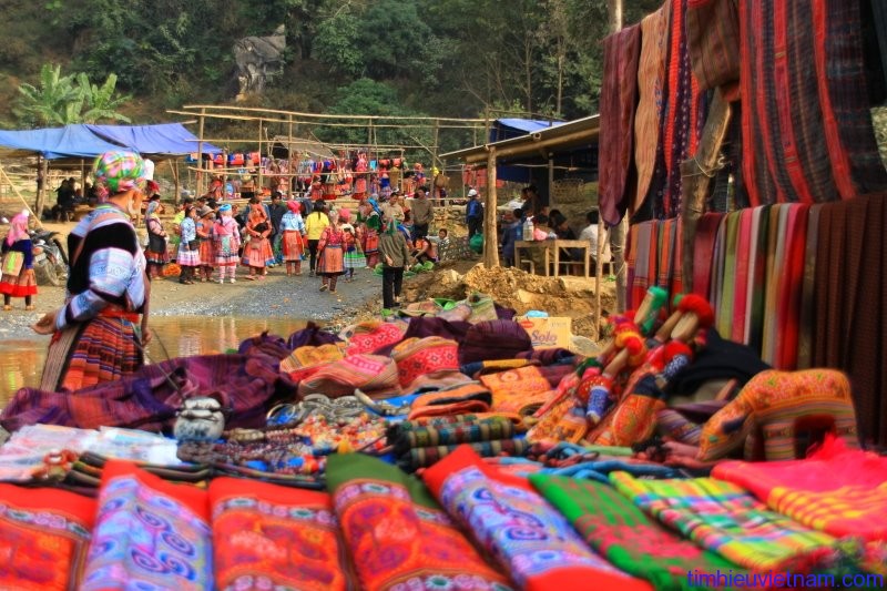 Hal yang menonjol di pasaran-pasaran daerah pegunungan ialah warna-warni pakaian warga etnis-etnis ketika datang ke gerai-gerai kain ikat yang banyak dipajang di atas permukaan tanah. Siapa yang pernah sekali datang ke provinsi Ha Giang untuk mengunjungi pasar-pasar di beberapa kabupaten Meo Vac, Dong Van, Quan Ba, Hoang Su Phi, Xin Man dan lain-lain…pasti tidak melupakan segi-segi yang khas di pasaran-pasaran di daerah ini. Di provinsi Ha Giang, sering ada pasaran-pasaran mundur yang diselenggarakan di kecamatan-kecamatan. Jika pada pekan ini diselenggarakan pada hari Minggu, maka pasaran berikutnya akan diselenggarakan pada hari Sabtu. Sedangkan pasaran-pasaran tingkat kabupaten diselenggarakan pada hari Minggu. Datang sesudah berjanji, para gadis dalam rok-rok tradisional yang berwarna-warni, dengan payung di tangan dan keranjang gendongan di punggung mereka, sedangkan para lelaki membawa ayam, babi dan sapi ke pasar. Seorang wisatawan Italia memberitahukan: “Di Italia, mereka tidak melihat binatang yang dijual di pasar seperti di sini. Saya menyukai kuliner dan bisa menikmati masakan-masakan yang dijual di pasar ini. Pakaian warga etnis di daerah ini juga membuat saya sangat menyukainya”.