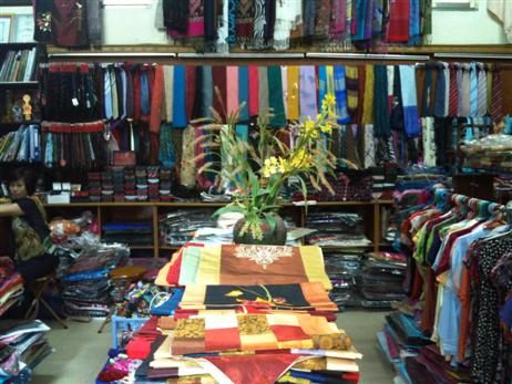 Di dalam toko, produk dari sutra dipajang sana-sini