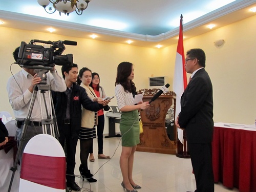 (VOVworld) – Pada Selasa pagi (26 November) di markas Kedutaan Besar Republik Indonesia (KBRI) di kota Hanoi, Vietnam diadakan jumpa pers periodik dengan kehadiran wakil dari kira-kira 10 kantor pemberitaan, Radio dan Televisi Vietnam. Dalam jumpa pers ini, Duta Besar Indonesia di Vietnam, Mayerfas telah mengiktisarkan kembali perkembangan-perkembangan melompat yang dicapai Indonesia, bersamaan itu menilai hubungan bilateral Indonesia – Vietnam pada tahun 2013.