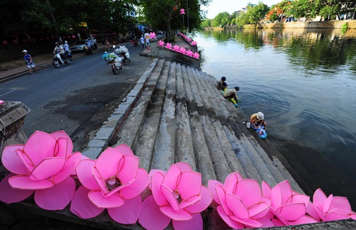 (VOVworld) - Pada hari-hari belakangan ini, kota Hue (Vietnam Tengah) tampaknya mengalami perubahan kuat dengan berbagai hiasan untuk menyambut perayaan Weisak ke-2559 - tahun 2015. Di semua jalan, jembatan di kota Hue dihiasi dengan bendera agama Buddha dan bunga teratai. Pagoda-pagoda di kota Hue tampaknya lebih bergelora dan berwarna-warni sehubungan dengan peristiwa ini.