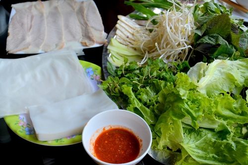 Satu porsi kue Trang gulung daging babi rebus se-harga kira-kira 2 dolar Amerika Serikat yang bahannya terdiri dari satu piring besar sayur-sayuran hijau dengan bermacam jenis sayuran harum, satu piring bermacam jenis buah yang diiris kecil untuk digulung seperti ketimun, pisang mentah, nanas, kol ungu, tauge, satu piring daging babi yang diiris dengan ukuran besar dan tipis, satu piring lembar kwetiaw dan satu piring kue “Trang”, semuanya diletakkan di piring-piring warna hijau yang kelihatan sangat menarik. Tentunya tidak bisa kurang saus tutul yang menciptakan rasa khas masakan ini.