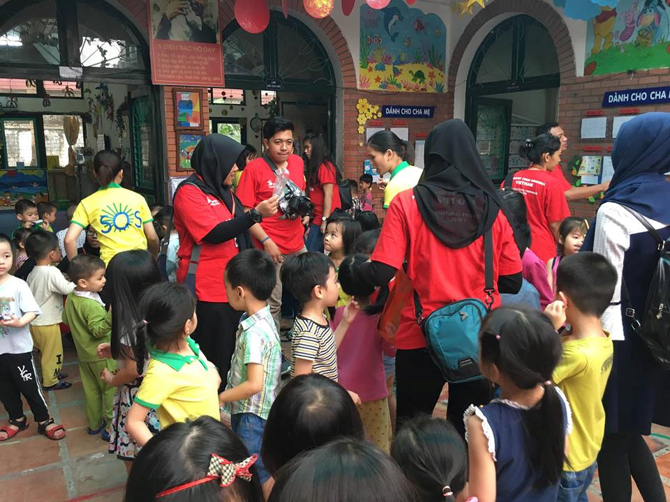 Pada pukul 9.30, anak-anak di Taman Kanak-Kanak SOS Hanoi sedang bergembira pada waktu istirahat. Pada hari ini, suasana tampak lebih ramai ketika dikunjungi oleh para anggota rombongan FFI. Ketika melihat para anggota rombongan FFI dari jauh, anak-anak sudah beramai-ramai keluar solah-olah seperti kawanan tawon. Walaupun tidak tahu bahasa satu sama lain, tetapi dengan sinar mata dan tingkah laku yang mereka berikan satu sama lain tampaknya seperti saudara-saudara dalam satu keluarga. Anak-anak sangat suka dipotret, suka mendapat manisan dan suka bermain bersama dengan para anggota rombongan ini. Bu guru Nguyen Thanh Huong, guru kepala kelas anak-anak yang berusia 4 tahun memberitahukan: “Ini merupakan Perkampungan Anak-Anak SOS, maka selalu dikunjungi oleh delegasi-delegasi. Aktivitas sehari-hari dari anak-anak ialah belajar sambil bermain dan ketika dikunjungi oleh tamu, mereka merasa lebih gembira dan suasananya lebih bergelora”.