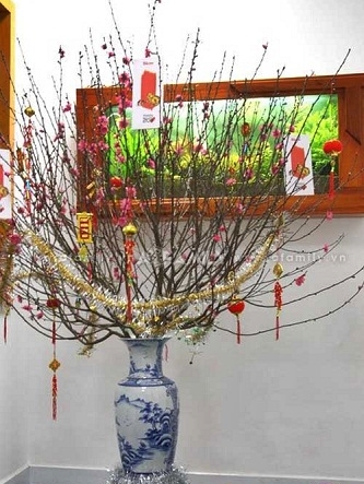 Tuan rumah menghiasi ranting bunga Mei yang segardengan kata-kata