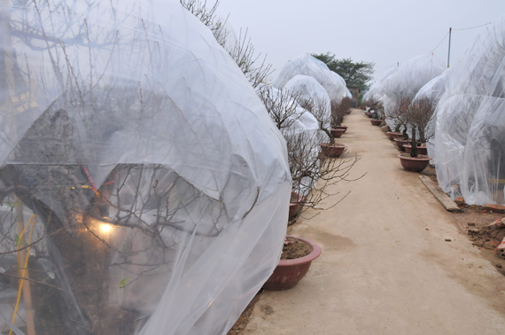Petani menggunakan kantong plastik dan lampu untuk menghangatkan pohon Mei