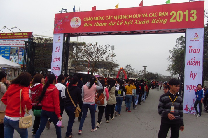 Juga seperti beberapa tahun lalu, sejak dini hari, Stadion Nasional My Dinh telah menyerap kedatangan cukup banyak pemuda untuk ikut memberikan donor darah, turut memenuhi sumber darah untuk kira-kira 120 rumah sakit di Vietnam Utara. Ciri khas dari Pesta Musim Semi Merah tahun ini ialah ada partisipasi dari ratusan pasangan kekasih dan keluarga. Datang sejak pagi hari, Pham Van Minh dan Pham Thi Thanh Van merupakan salah satu diantara 6.000 pasangan kekasih yang datang memberikan donor darah pada Pesta Musim Semi Merah ini. Ini merupakan donor darah yang ke-8 bagi Van dan ke-2 bagi Minh. Pham Van Minh berharap supaya pada waktu mendatang mereka dapat terus berpartisipasi pada banyak Pesta seperti ini lagi.