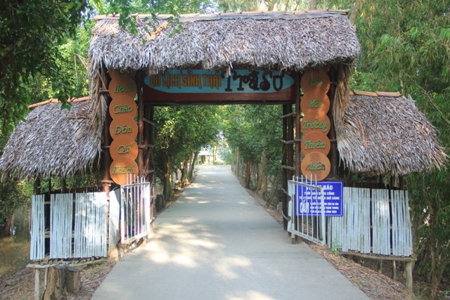 Gerbang pintu masuk ke hutan pohon gelam Tra Su sangat sederhana