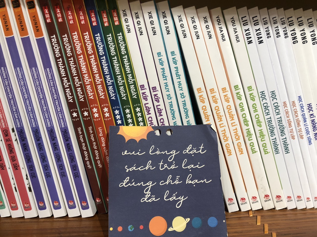 Tulisan dengan isi “mari menempatkan buku ke tempatnya" yang dipasang di rak buku (Foto: Phuong Thao) |