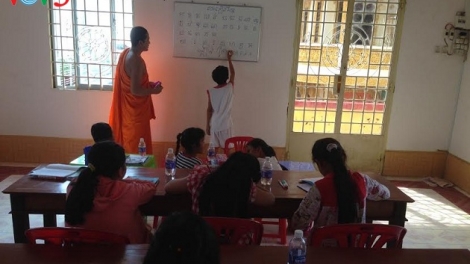 (VOVWORLD) - Sekarang ini, aksara Khmer telah dimasukkan oleh Kementerian Pendidikan dan Pelatihan Vietnam ke dalam program pengajaran di semua kabupaten kota dan kabupaten tempat pemukiman banyak warga etnis minoritas Khmer. Di kabupaten kota Ninh Kieu, jantungnya kota Can Tho, warga etnis minoritas Khmer tidak banyak, maka berbagai sekolahan umum tidak punya cukup syarat untuk mengajar aksara Khmer. Oleh karena itu, ketika pagoda Munirangsay membuka kursus pengajaran aksara Khmer, banyak keluarga warga etnis minoritas yang sedang hidup dan bekerja di kota Can Tho telah sangat gembira membawa anak-anaknya ikut serta.