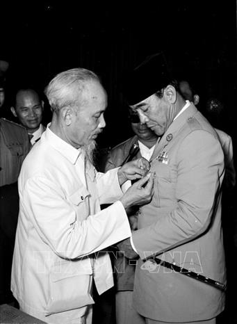 Presiden Ho Chi Minh menyampaikan Bintang Perang Perlawanan Kelas Satu kepada Presiden Soekarno. (Foto: VNA)