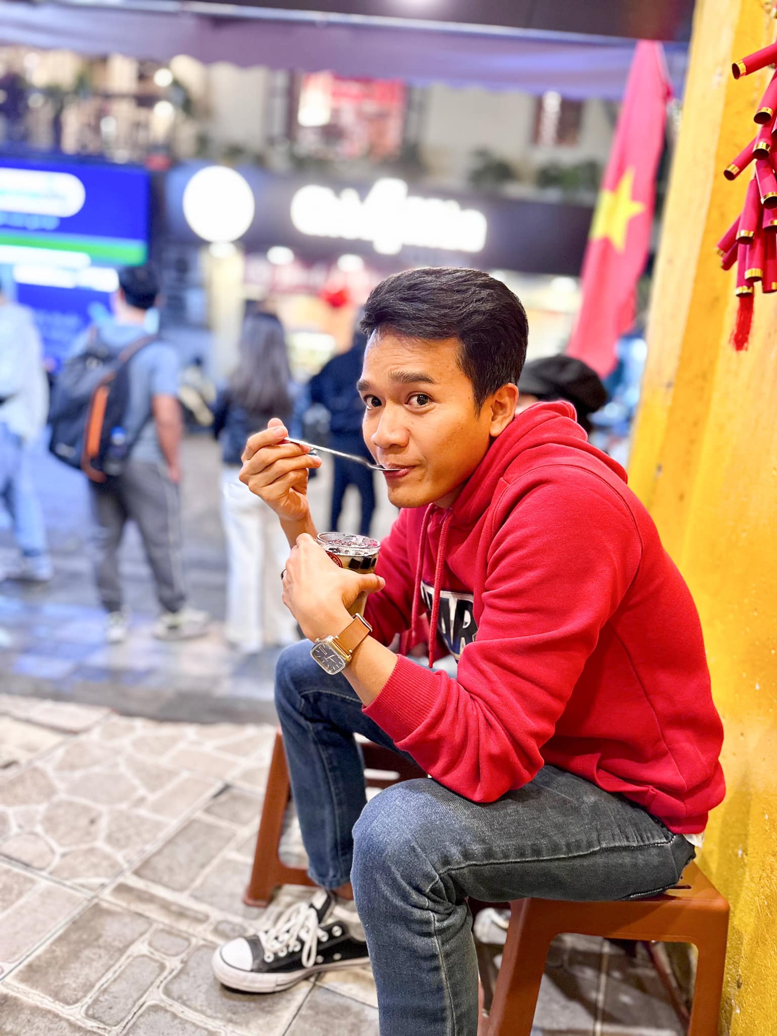Aris menikmati kolak Vietnam, salah satu hidangan favoritnya (Foto: FB Aris Setiawan) |