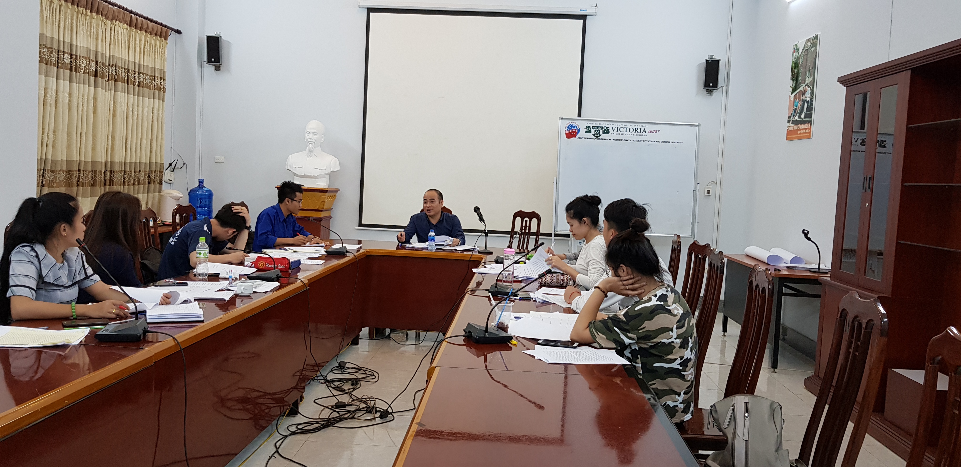 Pada pukul 6.30 hari awal pekan, dosen yang datang dari Kementerian Luar Negeri (Kemlu) Vietnam dan 12 mahasiswa Laos yang sedang menempuh kuliah untuk program magister di Akademi Diplomatik sedang duduk di sekitar meja yang berbentuk oval untuk mendengarkan dan berbahas tentang cara penerjemahan langsung dalam pertemuan dan kontak tingkat tinggi antara dua negara.