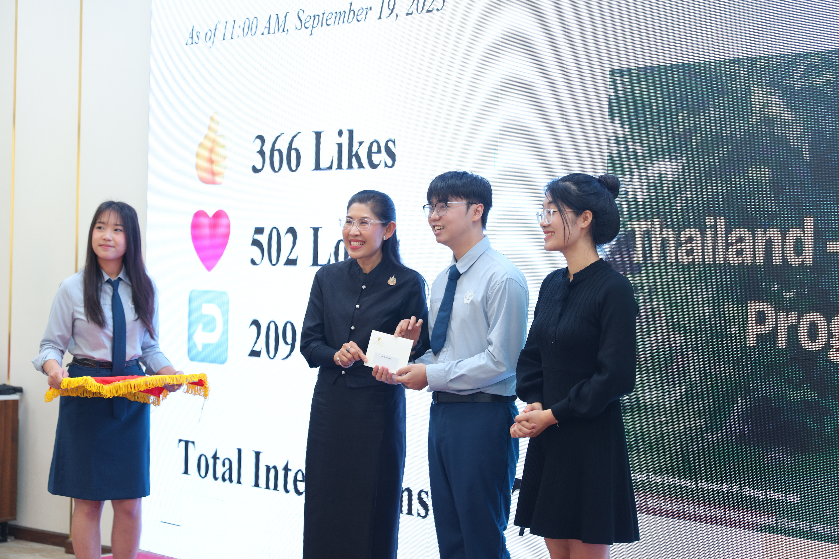 Dubes Thailand menyampaikan penghargaan kepada tim pemenang hadiah pertama. Foto: Minh Ly