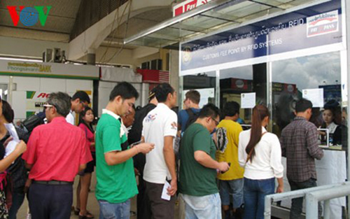 Para pekerja Vietnam membuat prosedur imigrasi di koridor perbatasan Laos-Thailand