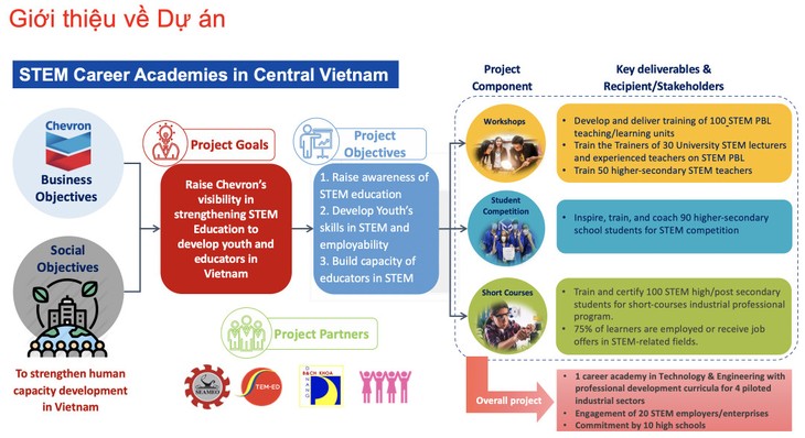 Proyek "Akademi vokasi STEM kawasan Vietnam Tengah" memobilisasi total biaya sebesar 194.500 USD. Di antaranya, Grup Chevron menyumbangkan 150.000 USD dan Universitas Sains dan Teknologi-Universitas Da Nang menyumbangkan 44.500 USD. Setelah program uji coba diselesaikan, hasilnya akan disampaikan kepada para pihak terkait, pemerintah, dan swasta untuk mempertimbangkan perluasan program.