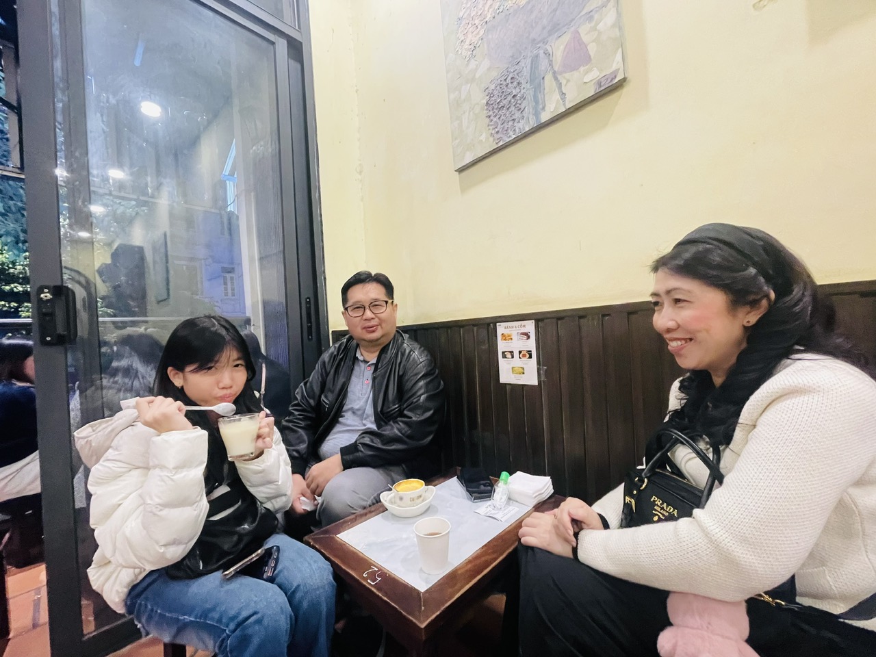 Berkat adanya konsultasi dan bimbingan dari seorang teman lokal, Bapak dan Ibu Iwan telah mengunjungi warung Kopi Giang di Jalan Nguyen Huu Huan untuk menikmati kopi telur, satu minuman yang khas dari Kota Hanoi yang disebut-sebut oleh sangat banyak wisatawan. Dan kopi telur memang telah tidak mengecewakan mereka: