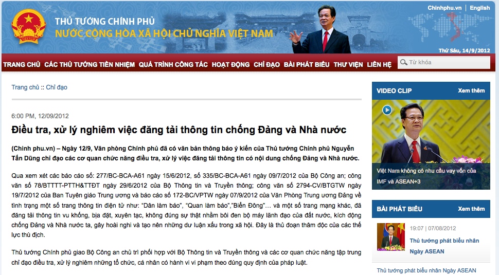 Sebelum PM Nguyen Tan Dung memberikan instruksi ini, laporan yang dikeluarkan Kementerian Keamanan Publik, Kementerian Informasi dan Komunikasi, Departemen Komunikasi dan Pendidikan Komite Sentral Partai Komunis Vietnam serta Kantor Komite Sentral Partai Komunis Vietnam memberitahukan bahwa beberapa website belakangan ini memuat banyak informasi yang berisi fitnahan, fabrikasi, pemutar-balikan dan tidak sesuai dengan kenyataan tentang mesin kepemimpinan Tanah Air, memutar-balikkan haluan dan kebijakan Partai Komunis dan Negara Vietnam, mempropagandakan nilai-nilai “kebebasan” dan “demokrasi” ala Barat. Pada kenyataannya, semua Website tersebut serta banyak Website dari organisasi-organisasi reaksioner asing lain telah dan sedang mengacaukan lingkungan informasi di jaringan Internet, menghasut tindakan anti Partai Komunis dan Negara, menimbulkan kepanikan di kalangan massa dan rakyat tentang usaha pembangunan, pengembangan dan pembaruan Tanah Air Vietnam.