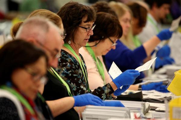 Para personel musiman untuk pekerjaan pemilu menyiapkan kotak suara dan suara di Renton, Washington