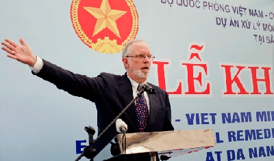 Duta besar AS membacakan pidato di acara peresmian pembersihan zat beracun/dioxin di bandara Da Nang.