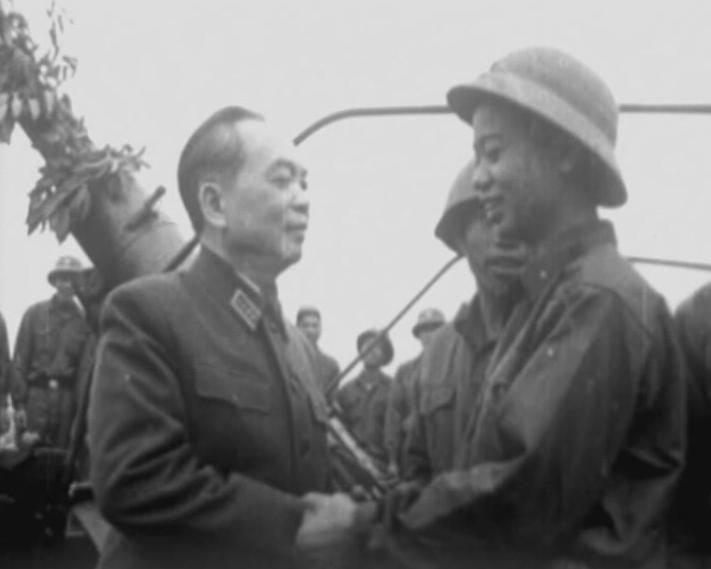 Jenderal Vo Nguyen Giap menyemangati para prajurit angkatan penangkis udara sebelum menyerang pesawat terbang B.52 tentara Amerika Serikat .