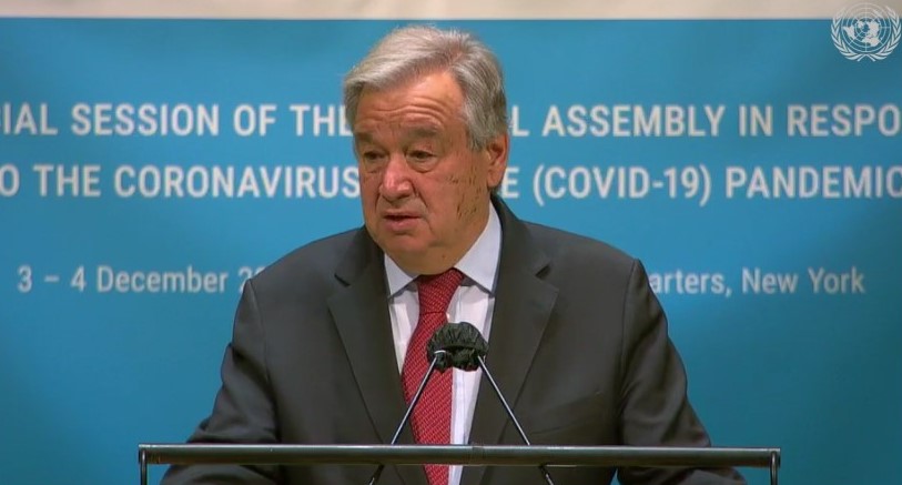 Berbicara di depan sidang tersebut, Sekretaris Jenderal (Sekjen) PBB, Antonio Guterres, mengatakan bahwa sampai sekarang, pandemi telah merampas jiwa lebih dari 1,5 juta orang di dunia dan semakin memperburuk tantangan-tantangan jangka panjang lainnya, di antaranya ketidaksetaraan gender dan perubahan iklim. Menurut peringatan Sekjen PBB, dunia mungkin harus menghadapi dampak-dampak wabah Covid-19 untuk puluhan tahun mendatang, bahkan ketika vaksin pencegah penyakit disahkan untuk digunakan. Sekjen PBB menunjukkan bahwa, kemajuan-kemajuan ilmiah yang cepat dicapai selama waktu belakangan ini patut mendapat pujian, tetapi vaksin bukan “obat luar biasa” untuk menghadapi wabah Covid-19 yang tengah merajalela di seluruh dunia. Sekjen Antonio Guterres juga mengulangi lagi imbauan bahwa vaksin Covid-19 seharusnya dianggap sebagai “sejenis barang umum global” untuk dibagikan kepada penduduk di seluruh dunia, sekaligus mengimbau sumbangsih dari negara-negara untuk menebus kekurangan pos keuangan senilai 4,3 miliar USD dalam menghadapi wabah Covid-19 untuk waktu dua bulan mendatang.