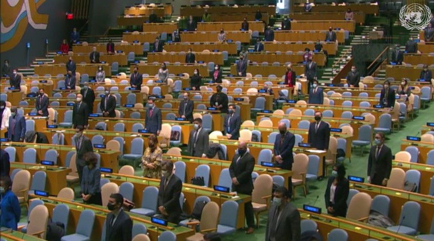 Para utusan menyediakan satu menit untuk mengheningkan cipta para korban Covid-19, dalam satu sidang, 3/12/2020 (Foto: UN) |