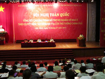 PM Vietnam Nguyen Tan Dung membacakan pidato pada Konferensi Nasional mengevaluasikan Program bantuan perumahan kepada kepala keluarga miskin dari pemerintah