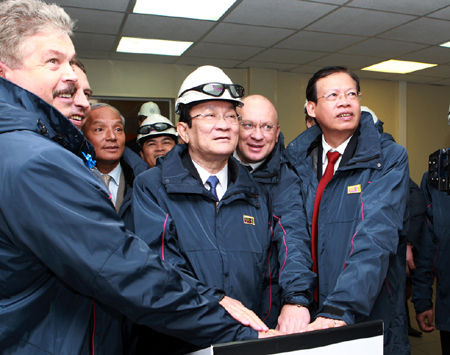 Presiden Truong Tan Sang menekan tombol mengoperasikan tambang Khôxêđaut Barat ( Zona Otonomi Nhenhetxki) .