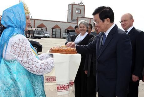 Presiden Truong Tan Sang diundang rakyat mencicipi kua tradisional Rusia .