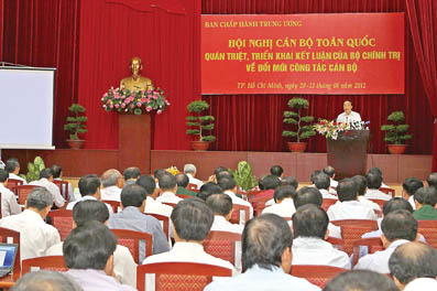 Dalam semua aktivitas revolusi, kader adalah pemimpin membimbing massa, mengorganisasi pekerjaan, adalah inti dari satu organisasi, adalah poros dari satu gerakan dan dalam semua periode dan di semua bidang, semua daerah, kader juga memainkan peranan yang menentukan terhadap sukses-gagalnya usaha revolusi. Pada konferensi kali ini, Sekjen Nguyen Phu Trong juga menegaskan: pekerjaan kekaderan selalu merupakan masalah kunci dalam pekerjaan pembangunan Partai, adalah segi yang maha penting dalam seluruh aktivitas Partai Komunis Vietnam. Pekerjaan kekaderan terdiri dari banyak mata rantai yang sambung menyambung, berselang-seling, terdiri dari penilaian kader, perancangan, pendidikan, pemupukan, mutasi, penempatan, penggunaan kader dan lain-lain. Sekjen Nguyen Phu Trong mengatakan: pekerjaan kekaderan dilakukan menurut prinsip sentralisme demokrasi, ada pengawasan, pemerikaan terhadap pekerjaan kekaderan dan pengelolaan kader. Sekjen Nguyen Phu Trong menekankan: “Pada pihak subyektif, yang penting ialah hati dan kaliber orang yang menilai. Walaupun ada mekanisme dan ketentuan, tapi bagaimana cara menilai, maka ia akan mendominasi semuanya. Penilai di sini meliputi atasan dan badan pemberi masukan. Mereka harus benar-benar orang yang jernih, berhati publik, obyektif dan punya banyak pengalaman serta santun dalam kehidupan praktek. Harus bermata jeli. Harus punya visi baru sehingga bisa menemukan dan menilai kader secara tepat. Harus menggunakan informasi secara tepat. Harus menilai kader dari banyak sudut, banyak waktu, melalui pekerjaan praktek, memperhitungkan hasil-guna pekerjaan, meninjau cara memecakhan urusan untuk memberikan penilaian, terutama pada masa-masa sulit, ada tantangan, “api menggembleng baja, kesuitan menggembleng manusia”.