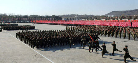 Tentara RDR Korea melakukan parade militer untuk mengenangkan almarhum pemimpin Kim Il Sung dan Kim Jong Il serta menyampaikan kesetiaan dengan pemimpin baru Kim Jong Un pada tanggal 18 Februari tahun 2012