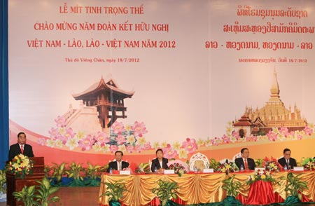 Tahun 2012 adalah satu tahun yang khusus dalam hubungan istimewa antara dua negara Vietnam dan Laos. Ini adalah “Tahun Solidaritas dan Persahabatan Vietnam-Laos” sehubungan dengan peringatan ulang tahun ke-50 penggalangan hubungan diplomatik (5 September 1962- 5 September 2012), peringatan ulang tahun ke-35 penandatanganai Traktat Persahabatan dan Kerjasama Vietnam-Laos (18 Juli 1977-18 Juli 2012) dengan banyak aktivitas yang praksis dan signifikan, memanifestasikan secara hidup-hidup solidaritas dan persahabatan istimewa serta hubungan kerjasama komprehensif antara dua negara. Dalam kerangka semua aktivitas peringatan ini, yang menonjol ialah pertukaran-pertukaran delegasi tingkat tinggi, rapat umum yang khidmat untuk memperingati hubungan istimewas Vietnam-Laos, rapat umum untuk memperingati tradisi persekutuan militan Vietnam-Laos, festival persahabatan rakyat Vietnam-Laos, sayembara mencari tahu sejarah hubungan istimewas Vietnam-Laos dan Laos-Vietnam dan lain-lain. Kunjungan yang dilakukan oleh Sekjen, Presiden Laos, Choummaly Sayasone di Vietnam berlangsung pada waktu mengevaluasikan Tahun Solidaritas dan Persahabatan dengan banyak sukses baik. Dalam keterangannya kepada wartawan Radio Suara Vietnam menjelang kunjungan ini, Deputi Menteri Luar Negeri Laos, Sunthoong Sayachac menegaskan: “Kami menilai sangat tinggi kunjungan-kunjungan tingkat tinggi yang dilakukan oleh para pemimpin dua negara. Pada awal tahun ini, Presiden Vietnam Truong Tan Sang melakukan kunjungan di Laos dan sampai akhir tahun ini ialah kunjungan yang dilakukan oleh Sekjen, Presiden Republik Demokrasi Rakyat Laos, Choummaly Sayasone di Vietnam. Kunjungan-kunjungan ini telah menciptakan titik balik yang baru bagi hubungan antara dua negara. Hubungan politik yang baik merupakan dasar bagi semua hubungan lain”.
