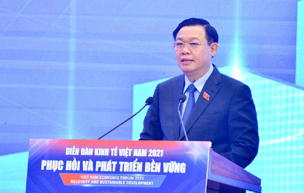 Ketua MN Vuong Dinh Hue berbicara pada forum Ekonomi Vietnam 2021 dengan tema: "Pemulihan dan Pengembangan yang Berkelanjutan" (Foto: hanoimoi.com.vn) |