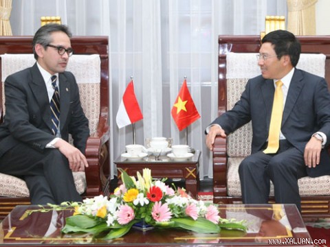 Menlu Vietnam Phạm Bình Minh melakukan pembicaraan dengan Menlu Indonesia Marty Natalegawa di Hanoi .