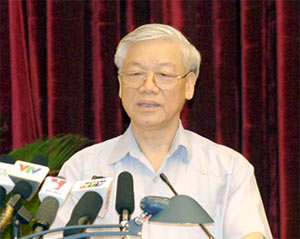 Sekjen KS PKV Nguyen Phu Trong membacakan pidato di depan Sidang Pleno ke-6 PKV