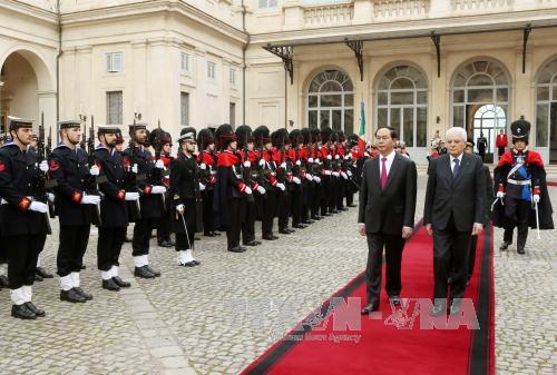 Persinggahan kedua dari perlawatan Presiden Tran Dai Quang adalah Italia yang berlangsung dari 21-24/11/2016. Dalam semua pembicaraan dan pertemuan antara Presiden Tran Dai Quang dengan para pemimpin senior dan pemimpin daerah, wakil dari partai- partai sayap kiri Italia, dua fihak menegaskan terus mendorong semua mekanisme kerjasama yang sekarang ada, khususnya menargetkan akan berusaha membawa nilai perdagangan dari tarap 4,3 miliar dolar Amerika Serikat sekarang ini mencapai 6 miliar dolar Amerika Serikat pada tahun-tahun 2017-2018. Dua fihak menegaskan saling mendukung, melakukan koordinasi erat di semua mekanisme dan forum multilateral, Italia mendukung Vietnam dalam hubungan dengan Uni Eropa, mendorong cepat menandatangani Perjanjian Perdagangan Bebas antara Vietnam dan Uni Eropa.