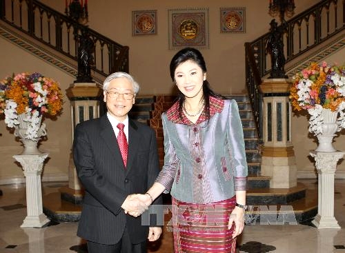 Perdana Menteri ThailandYingluck Shinawatra menyambut Sekjen KS PKV Nguyen Phu Trong