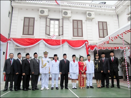 | Para pejabat dan staff KBRI yang menghadiri acara mengerek bendera ini |